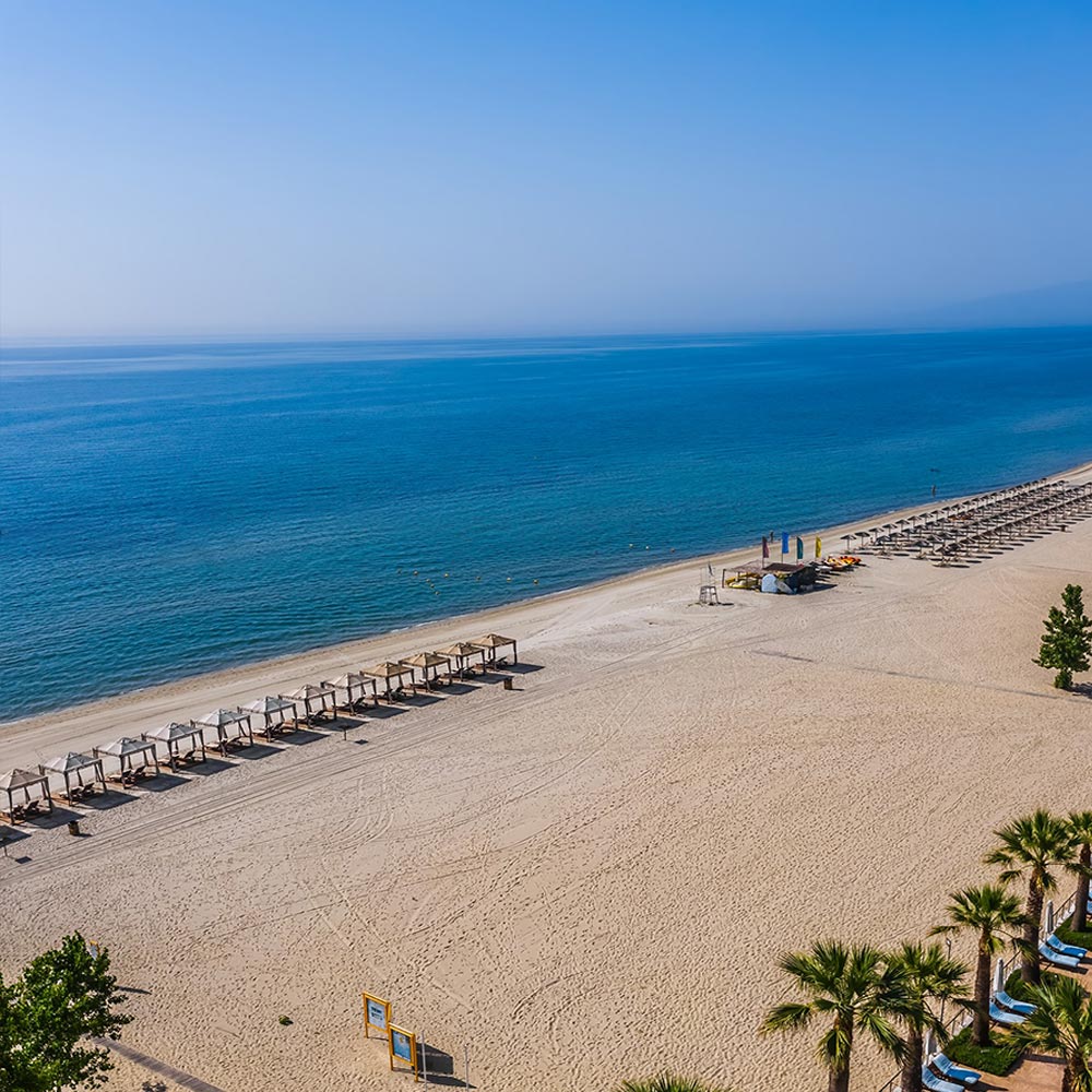 Πλατιά αμμώδης ακτή μήκους πολλών χιλιομέτρων με λεπτή, καθαρή άμμο και ρηχή θάλασσα, βραβεύεται επί σειρά ετών από το ευρωπαϊκό πρόγραμμα «Γαλάζιες Σημαίες» και αποτελεί πόλο έλξης των επισκεπτών.